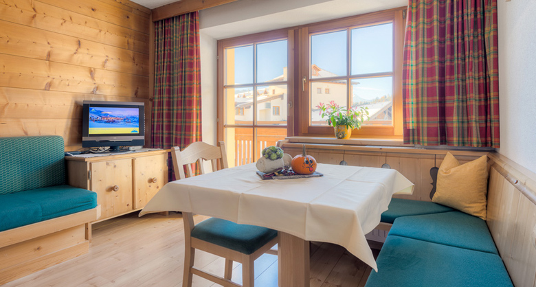 Wohnraum mit Couch und Essplatz, komplett eingerichtete Kochzeile, Schlafzimmer, Dusche - WC getrennt, Balkon